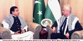Islamabad(TNS) : NA Speaker visits Palestine Embassy: strongly denounces Israeli war...