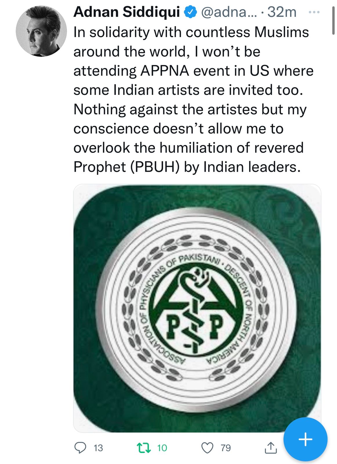 Islamabad: Jun 19, 2022 (TNS): The iconic actor-producer Mr. Adnan Siddiqui will not be attending APPNA to be held in the US from July14-16 given that Indian artistes too will be part of the program. As a self-respecting Muslim, Mr. Siddiquistrongly condemns the insolent and obscene remarks made by Hindu right-wing Indian politiciansagainst the beloved Prophet (PBUH). “My conscience will never allow me to be in the same space asartists from the country that has insulted our Prophet. I have nothing against the artists personally butas a form of personal protest and as solidarity for my Muslim brethren worldwide,