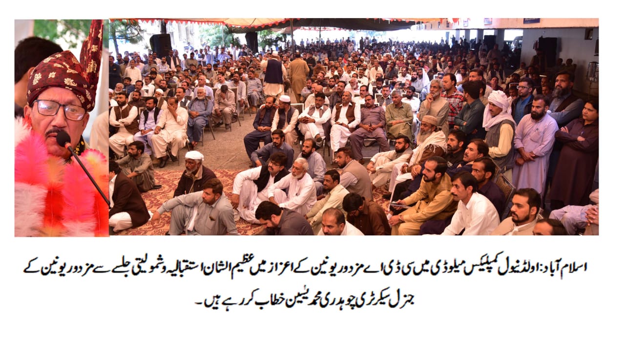 Islamabad A grand reception and induction meeting was held in the honour of CDA Mazdoor Union at Old Newal Complex, Melody. CDA Mazdoor Union General Secretary Chaudhry Muhammad Yasin, President Aurangzeb Khan, Chairman Raja Shakir Zaman Kayani, Sufi Mehmood Ali, Haji Saber, Sardar Mohammad Asif, Haji Mushtaq Ahmed Shahid, Malik Asim, Sanaullah Khan, Chaudhry Chief officials of CDA Mazdoor Union including Imran, Yasir Mahmood, Chaudhry Shahid Khatana, Khalid Mehmood, Sardar Khan Niazi, Raja Raees, Raja Adnan Shafiq, Chaudhry Tariq Gujjar, Chaudhry Wajid Gujjar, Chaudhry Abrar, representatives of CBA Committees and thousands of employees participated fully. On this occasion, Chairman of Sadiq Group, Asif Sadiq, Qaiser Sadiq, Nasir Sadiq, Babar Nazeer, Dalwar Masih and Environment Directorate Faisal Avenue Malik Shakeel Ahmed, Mohammad Arif, Mohammad Maskeen, Naseer Ahmed, Seventh Avenue Mohammad Zubair Supervisor, Tariq Mehmood, Sudhir Ahmed, Mohammad Naseer, Safdar Mahmood, Muhammad Irfan, Sardar Muhammad Tayyab from Lake View Park, Sheikh Waseem Abbas, Muhammad Rizwan and others announced to leave Amanullah and Pasha Group and join the CDA Mazdoor Union (Chaudhry Muhammad Yasin Group) along with hundreds of their colleagues. On this occasion, the newly joined employees said that we have joined CDA Mazdoor Union after seeing its performance and services for the employees. It is serving the laborers, we will make the CDA Mazdoor union successful with a huge majority in the upcoming referendum. Speaking at the meeting, General Secretary of CDA Mazdoor Union Chaudhry Muhammad Yasin said that CDA Mazdoor Union has always given first priority to field staff and educated youth working in CDA and scaling up of all workers. Grades were made, numerous allowances were given to the employees working in different fields and they were increased, the time scale of seven thousand employees working in the institution and thousands of promotions were given to the field staff working in CDA. Be it people or educated clerical staff, all intelligent people express their faith in CDA labor union, today in this regard twenty five stenotypists (BPS-14) of the institution whose promotion was suspended for 17 years as stenographers ( BPS-16) orders which will bring prosperity to these families and they will be able to live better, he said that CDA Mazdoor union will strongly resist if Capital Hospital is privatized. CDA will file a review appeal from the platform of the Mazdoor Union and Pakistan Workers Federation to restore it, fight for the guardianship and support of widows and orphans at every forum and the affected families will not be left alone at any cost. The CDA Mazdoor union taught its employees to always pay their duties along with their rights because when the organization develops, the employee of the organization is prosperous. did not fool the employees while the incompetent and childish Jamhora Union always tried to play with the future of the employees by showing them a green garden, but those politicians of lies and hypocrisy do not have the courage to work hard in the field of referendum. They can fight against the odds, but CDA Mazdoor Union will, God willing, bring these people to the field of referendum and make them suffer a crushing defeat. Letters were distributed.