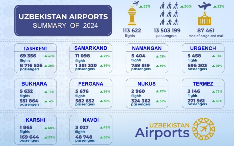 Cargo operations also witnessed substantial growth, with Uzbekistan’s airports handling 87,461 tons of freight and mail, a 23% increase compared to 2023.