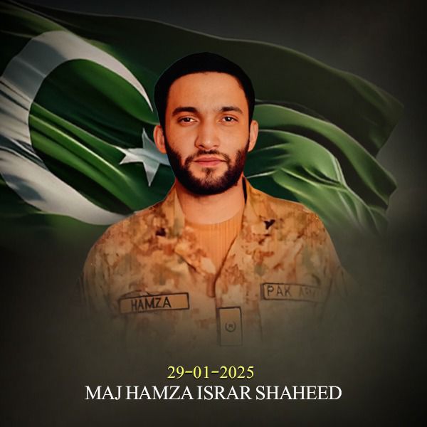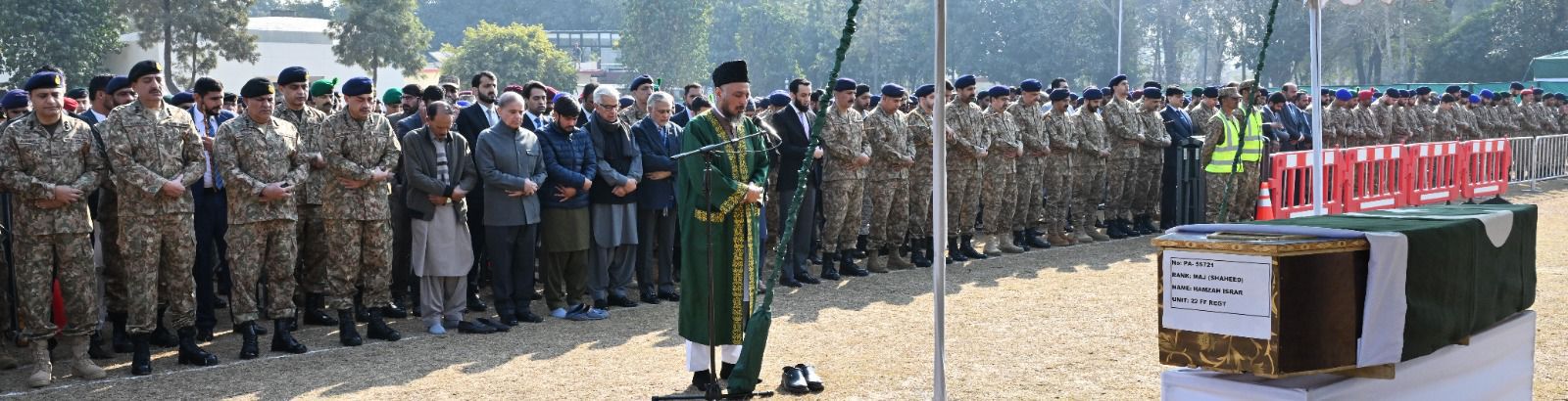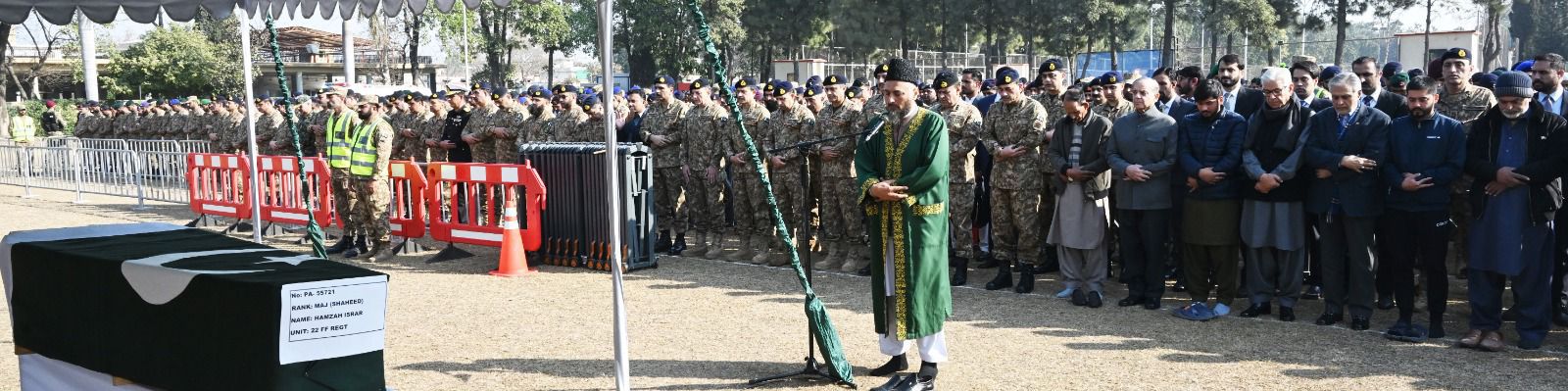 Rawalpindi (TNS) The funeral prayer of Major Hamza Israr Shaheed (aged 29, resident of District Rawalpindi), who embraced martyrdom while valiantly defending the motherland in Mir Ali, was solemnly offered at Chaklala Garrison, Rawalpindi.