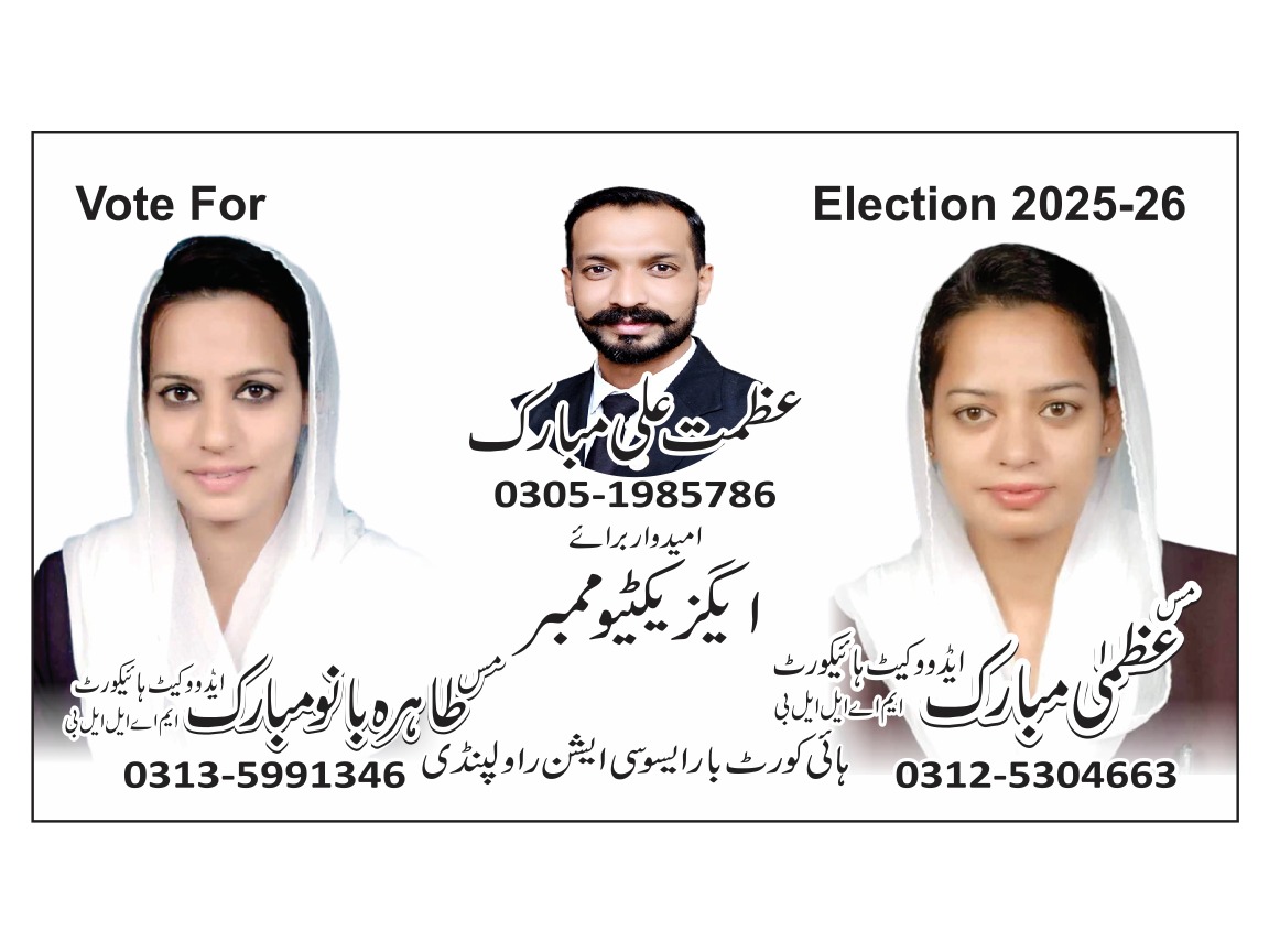 RAWALPINDI (TNS)(PR)Three real lawyers, sisters and brothers are ready to participate in the elections of High Court Bar Association Rawalpindi to be held on February 22. The Election Board of High Court Bar Association Rawalpindi has approved the nomination papers of Miss Tahira Bano Mubarak, Miss Uzma Mubarak and Azmat Ali Mubarak.