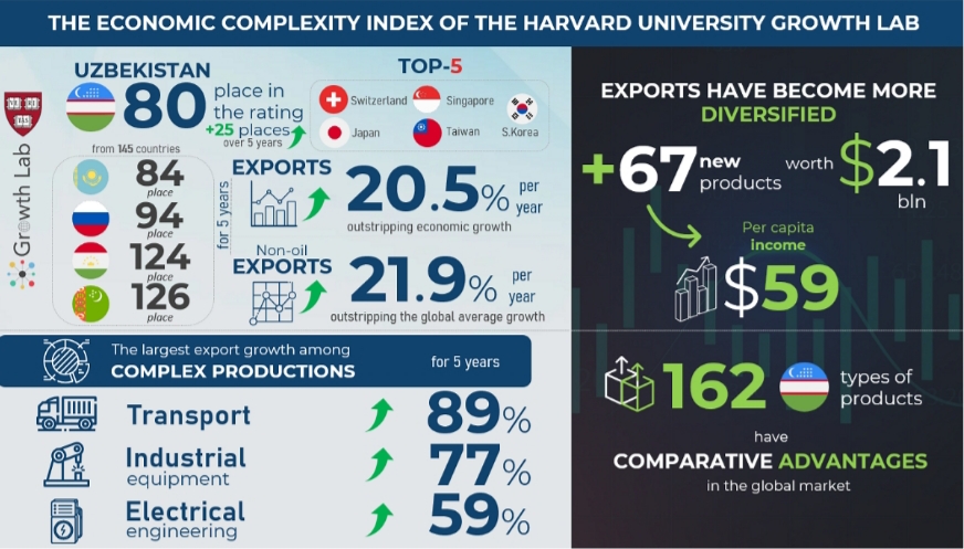TASHKENT, Wednesday, April 23, 2025 (TNS): Uzbekistan has recorded remarkable economic progress, rising 25 positions over the past five years to rank 80th among 145 countries in the latest Economic Complexity Index (ECI) published by the Growth Lab at Harvard University.