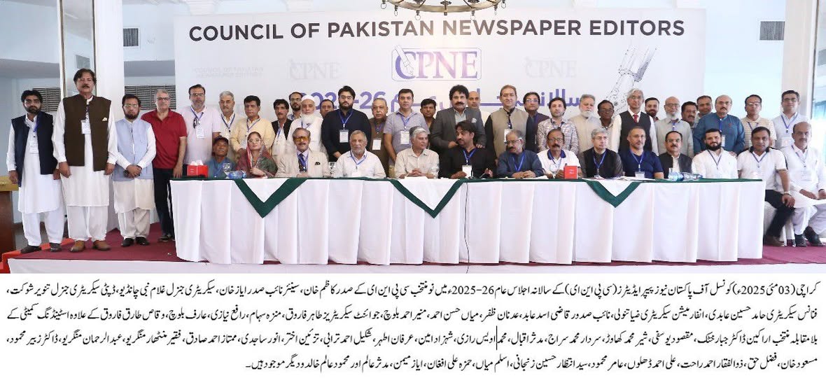 Islamabad (TNS) In the annual elections of the Council of Pakistan Newspaper Editors (CPNE) for the year 2025-2026, Kazim Khan of Daily Dunya and Ghulam Nabi Chandio of Daily Pak were elected unopposed as Secretary General, while Senior Vice President Ayaz Khan, Deputy Secretary General Tanveer Shaukat, Finance Secretary Hamid Hussain Abidi, Information Secretary Zia Tanoli, Vice Presidents Qazi Asad Abid, Adnan Zafar, Yahya Khan Saduzai, Mian Hassan Ahmed, Munir Ahmed Baloch, Joint Secretaries Tahir Farooq, Munza Saham, Rafi Niazi, Arif Baloch, Waqas Tariq Farooq were elected.