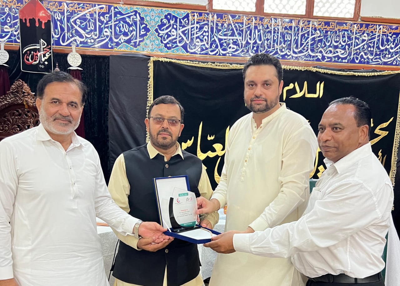Islamabad (TNS) Asghar Ali Mubarak, Fida Abbas Zaidi presenting shields to Ajmal Zaidi and others of Al-Qaim Lawyers Forum on the occasion of the 12th annual foundation day of Imamia Disaster Management Cell.
