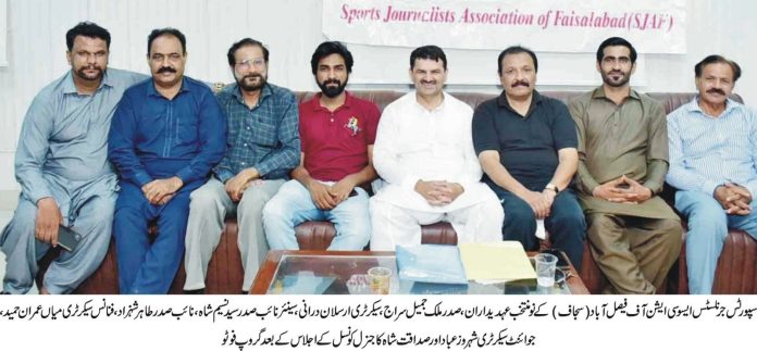 Faisalabad (TNS) In a meeting held at Iqbal Stadium of Sports Journalists Association Faisalabad (SJAF), Malik Jamil Siraj was unanimously elected President while Arsalan Durrani was elected General Secretary.