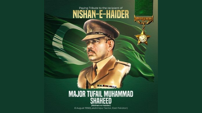 Rawalpindi, 08 August 2025 (TNS):Field Marshal Syed Asim Munir, NI (M), Chief of Army Staff, General Sahir Shamshad Mirza, NI (M), Chairman Joint Chiefs of Staff Committee, Admiral Naveed Ashraf, NI (M), Chief of the Naval Staff, and Air Chief Marshal Zaheer Ahmad Babar Sidhu, NI (M), Chief of the Air Staff, along with the Armed Forces of Pakistan, solemnly commemorate the 67th martyrdom anniversary of Major Tufail Muhammad Shaheed, Nishan-e-Haider, who embraced martyrdom in the line of duty while courageously engaging the enemy in the Lakshmipur sector of erstwhile East Pakistan.