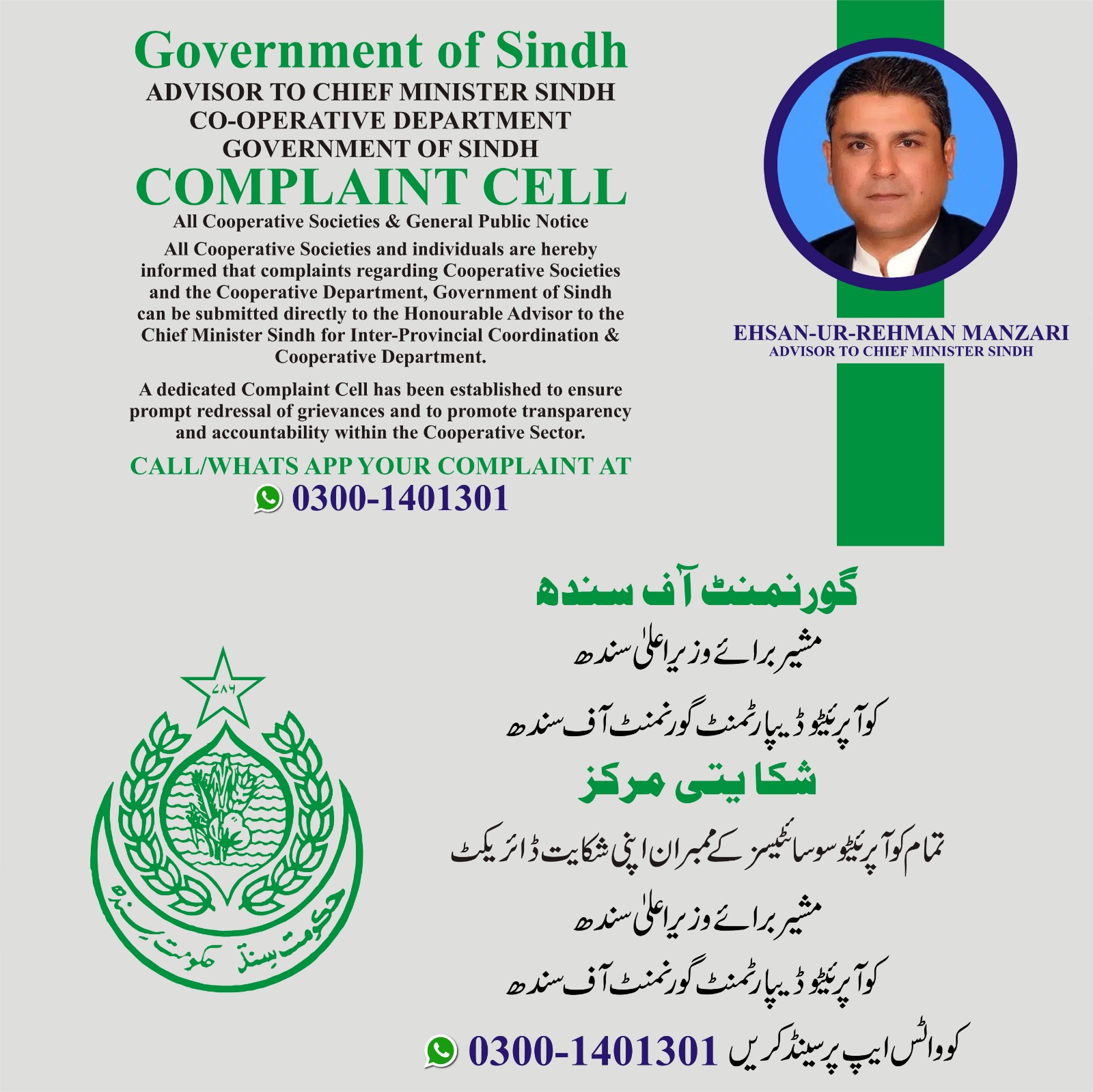 Located at the Registrar Cooperative Societies Office, Noman Arcade near Mashriq Centre, Gulshan-e-Iqbal, Karachi, the Complaint Cell will receive all grievances, which will be thoroughly examined and forwarded directly to the Advisor for prompt action. Speaking to the media, Sardar Mazari stated that the center aims to provide swift solutions to public issues while ensuring institutional transparency. He emphasized that corruption or negligence in cooperative society matters will not be tolerated. Citizens can lodge complaints regarding cooperative societies via WhatsApp at 0300-1401301 for immediate redressal. He added
