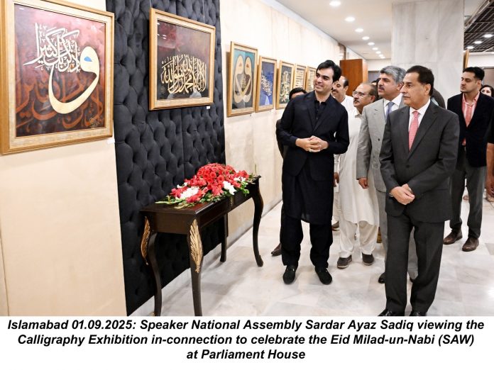 An exhibition of inspirational calligraphy artworks was organized in the National Assembly on the occasion of the blessed month of Rabi’ al-Awwal and the arrival of 1500 years since the birth of Hazrat Muhammad Mustafa (PBUH). These artworks present a glimpse of the blessed biography of the Holy Prophet (PBUH) and the glorious aspects of Islamic history. Speaker of the National Assembly Sardar Ayaz Sadiq said on this occasion that the Holy Personality of Hazrat Muhammad (PBUH) is a source of mercy and guidance for the entire humanity. Events based on the Biography of the Prophet (PBUH) refresh faith and are a beacon of light for the younger generation. In this way The spiritual and intellectual activities of the National Assembly promote unity, solidarity and brotherhood among the Muslim Ummah. Organizing such events in the National Assembly not only highlights religious and spiritual values but also plays a key role in promoting peace, brotherhood and religious harmony in the society. Speaker National Assembly Sardar Ayaz Sadiq inaugurated the exhibition at Parliament House. During the exhibition, renowned calligrapher Wasil Shahid briefed the Speaker National Assembly about the masterpieces of art and calligraphy exhibited in the exhibition. The event was attended by Deputy Speaker National Assembly Syed Ghulam Mustafa Shah, Member National Assembly Ijaz Jakhrani, Syed Hafeezuddin, people of different schools of thought and a large number of officers of the National Assembly Secretariat.