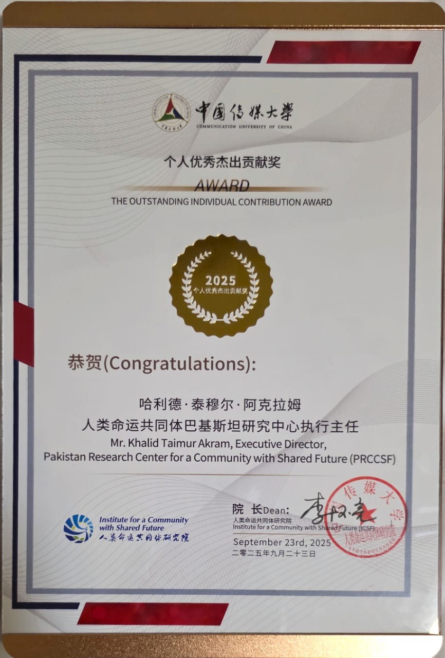 ISLAMABAD (TNS) On 23rd September 2025, Mr. Khalid Taimur Akram was honored with the prestigious “Outstanding Individual Contribution Award 2025” by the Communication University of China, Beijing. This marked the fifth consecutive year (2021–2025) that he received this esteemed award, making him one of the very few scholars consistently recognized across multiple years.