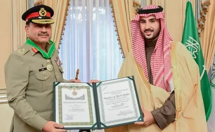 ISLAMABAD (TNS) Saudi Arabia’s Defense Minister Prince Khalid bin Salman bin Abdulaziz has awarded the King Abdulaziz Medal of Excellent Class, the highest Saudi honor, to Chief of Defense Forces and Chief of Army Staff Field Marshal Asim Munir for his efforts to promote Pak-Saudi relations. According to the report, there are five categories of the King Abdulaziz Medal: Excellent, First, Second, Third, and Fourth Class. This honor is typically bestowed upon those who have rendered exceptional services to Saudi Arabia or one of its institutions. Field Marshal Asim Munir was awarded this honor in recognition of his outstanding efforts to strengthen strategic relations and cooperation between the two countries. According to the report, the ceremony was held during a reception hosted in honor of Field Marshal Asim Munir by the Saudi Defense Minister in Riyadh. Prince Khalid bin Salman congratulated Field Marshal Asim Munir on his appointment as Pakistan’s Chief of Defense Forces and expressed his best wishes for him. During the meeting, both sides reviewed the historical relations between Pakistan and Saudi Arabia and strategic cooperation in the defense sector, while establishing global peace and security, and matters of mutual interest were also discussed.