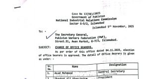 اسلام آباد (ٹی این ایس)پاکستان ورکرز فیڈریشن کے انتخابات کی این...