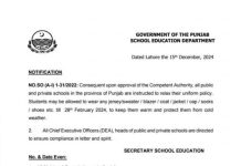 تفصیلات کے مطابق پنجاب حکومت کے نوٹیفکیشن کے مطابق تمام سرکاری و غیر سرکاری سکولوں میں 28 فروری تک طلباء و طالبات کسی بھی...