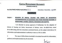 اسلام آباد (ٹی این ایس) منسٹری ہاؤسنگ اینڈ ورکس کی طرف سے جاری کردہ لیٹرنمبر4(8)92-پالیسی 04-11-2025 کے تحت اور سی ڈی اے مزدور یونین...