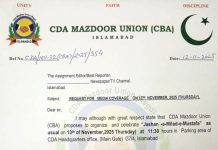 اسلام آباد (ٹی این ایس) سی ڈ ی اے مزدور یونین(سی بی اے)چوہدری محمد...