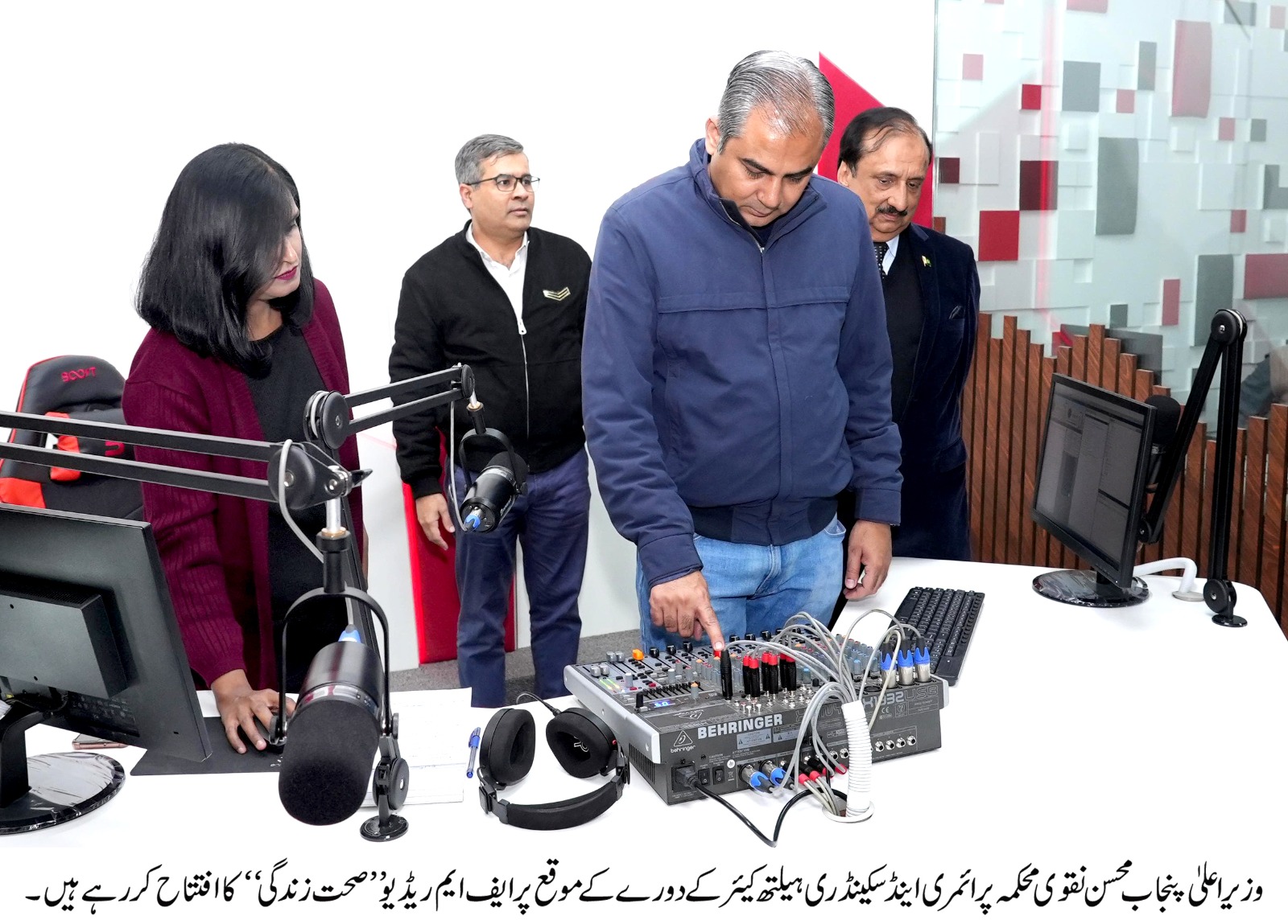 وزیر اعلیٰ محسن نقوی نے ایف ایم ریڈیو ”صحت زندگی“ کے سٹوڈیوز اورمختلف شعبوں کا معائنہ کیا،ایف ایم ریڈیو ”صحت زندگی“ کیلئے پیغام ریکارڈ کرایا