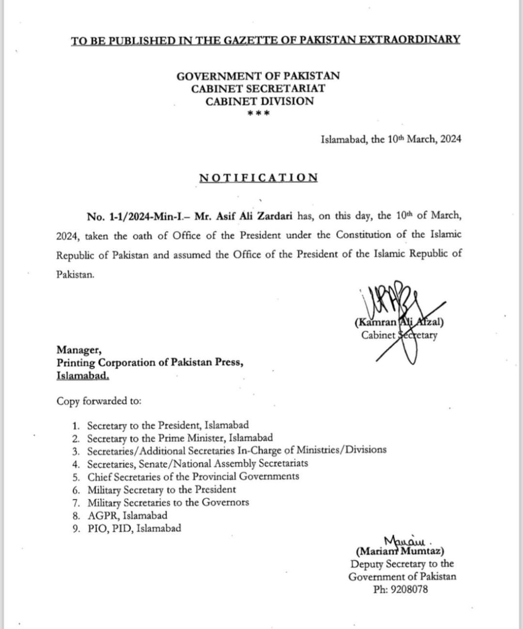 اپنے تہنیتی پیغام میں امیدوارصدر پاکستان اصغرعلی مبارک نے کہا کہ امید ہے دوسری بار صدر پاکستان منتخب ہونے پر آصف علی زرداری اس منصب پر فائز ہونے کے بعد غیر سیاسی رہیں گےاور ملک و قوم کی خوشحالی کے لیے اپنا آئینی کردار ادا کریں گے چین کے صدر شی جن پنگ اور ایران کے صدر ابراہیم رئیسی نے آصف علی زرداری کو پاکستان کا صدر مملکت منتخب ہونے پر مبارکباد دی۔ چینی صدر شی جن پنگ نے صدر آصف زرداری کو پاکستان کے 14ویں صدر کا عہدہ سنبھالنے پر مبارکباد دی ہے۔ اپنے پیغام میں شی جن پنگ نے کہا کہ چین اور پاکستان اچھے پڑوسی، دوست، شراکت دار اور بھائی ہیں اور دونوں ممالک کی آہنی دوستی دونوں عوام کے لیے قیمتی خزانہ ہے۔ انہوں نے کہا کہ دونوں ممالک نے حالیہ برسوں میں اعلیٰ سطح پر قریبی روابط کو برقرار رکھا، بنیادی باہمی مفادات اور اہم خدشات سے متعلق امور پر ایک دوسرے کی حمایت کی، پاک چین اقتصادی راہداری کی تعمیر میں نتیجہ خیز نتائج حاصل کیے اور اعلیٰ سطح کے دو طرفہ تعلقات کو برقرار رکھا۔ چینی صدر نے کہا کہ وہ پاک چین تعلقات کو بہت اہمیت دیتے ہیں اور چین اور پاکستان کے درمیان روایتی دوستی کو مزید فروغ دینے، مختلف شعبوں میں عملی تعاون کو بڑھانے اور پاکستان اور چین کی ہر موسم میں پائیدار تزویراتی تعاون پر مبنی شراکت داری کو مزید بہتر بنانے کے لیے صدر زرداری کے ساتھ مل کر کام کرنے کے لیے تیار ہیں۔ دوسری جانب ایران کے صدر سید ابراہیم رئیسی نے آصف علی زرداری کو پاکستان کا صدر منتخب ہونے پر مبارکباد دی ہے۔ ابراہیم رئیسی نے امید ظاہر کی کہ آصف زرداری کے دور صدارت میں دونوں ممالک کے درمیان تاریخی، ثقافتی اور مذہبی تاریخ کے تعلقات پہلے سے زیادہ مستحکم ہوں گے۔ ہمیشہ کی طرح اور خاص طور پر نئے دور میں اسلامی جمہوریہ ایران، اسلامی جمہوریہ پاکستان کے ساتھ باہمی تعلقات کو وسعت دینے کے لیے اپنی آمادگی کا اعادہ کرتا ہے۔,وہ پاکستان کے پہلے ایسے سیاستدان بن گئے ہیں جو دو مرتبہ منصب صدارت پر فائز ہوئے ہیں۔ 1955 میں پیدا ہونے والے آصف علی زرداری اپنے والدین کے اکلوتے بیٹے ہیں اور اُن کی تین بہنیں ہیں۔ آصف زرداری نے ابتدائی تعلیم سینٹ پیٹرک سکول سے حاصل کی جس کے بعد وہ پٹارو کیڈٹ کالج چلے گئے اور اُن کی آفیشل بائیو گرافی کے مطابق انھوں نے لندن سے بزنس میں گریجوئیشن مکمل کی ہے۔ آصف زرداری کے والد حاکم علی زرداری زمینداری کے علاوہ کراچی میں سنیما گھروں اور تعمیراتی شعبے سے منسلک تھے اور کسی زمانے میں وہ شیخ مجیب کی عوامی لیگ کا حصہ بھی رہے تھے۔ پاکستان الیکشن کمیشن کے ریکارڈ کے مطابق حاکم زرداری سنہ 1985 میں جنرل ضیاالحق کے دور میں غیر جماعتی بنیادوں پر ہونے والے انتخابات میں نوابشاہ سے قومی اسمبلی کا الیکشن لڑے لیکن ہار گئے۔اپنے والد سے قبل آصف علی زرداری نوابشاہ کی ضلعی کونسل کے انتخابات میں حصہ لے چکے تھے، جہاں انھیں شکست کا سامنا کرنا پڑا تھا۔پاکستان کے عوام سنہ 1987 سے قبل آصف زرداری کے نام سے ناآشنا تھے۔ اور پھر جب دسمبر 1987 میں اُن کی شادی سابق وزیر اعظم ذوالفقار علی بھٹو کی بیٹی اور سابق وزیراعظم بینظیر بھٹو سے ہوئی تو اسی نسبت سے اُن کا نام ملک بھر میں جانا پہچانا بن گیا شادی کے اگلے ہی برس یعنی 1988 میں ہونے والے عام انتخابات میں بھٹو کی جماعت پاکستان پیپلز پارٹی نے اکثریت حاصل کی اور بینظیر بھٹو ملک کی پہلی خاتون وزیراعظم بن گئیں۔ بینظیر اپنے ساتھ اپنے شوہر کو بھی وزیر اعظم ہاؤس لے آئیں، اور یہی وہ وقت تھا جہاں سے آصف زرداری کی سیاست، ان سے منسلک تنازعات کا آغاز ہوا۔صدر غلام اسحاق خان نے بینظیر بھٹو کی حکومت کو منتخب ہونے کے دو برسوں کے اندر ہی برطرف کر دیا اور اسمبلیاں تحلیل کر دیں۔ اسمبلیوں کی تحلیل اور ملک میں نواز شریف کی مسلم لیگ کی حکومت آنے کے کچھ ہی عرصے بعد 10 اکتوبر 1990 کو آصف زرداری پہلی مرتبہ گرفتار ہوئے اور جب نواز شریف کی حکومت برطرف ہوئی تو فروری 1993 میں انھیں رہائی ملی۔آصف زرداری پر مالی بدعنوانی، اغوا، اختیارات کے ناجا
