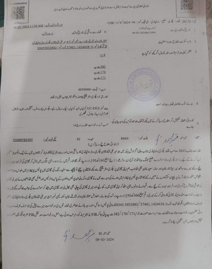 چکری روڈ کے قریب پیچھے سے آنے والی سفید رنگ کی گاڑی میں موجود پولیس یونیفارم پہنے 02 نامعلوم اشخاص نے ممتاز خان کی گاڑی کو رکنے کا اشارہ کیا،
