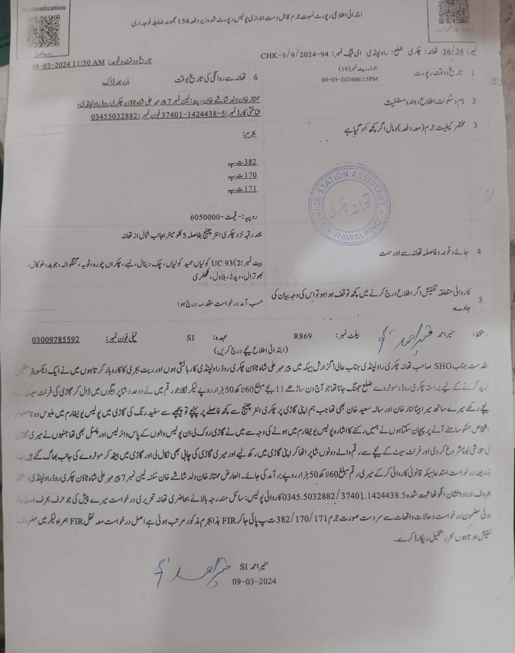 ممتاز خان کے مطابق پولیس اہلکار سمجھ کر گاڑی روکی تو وائرلیس اور پسٹل سے لیس ڈاکوؤں نے میری گاڑی کی تلاشی لیتے ہوئے فرنٹ سیٹ کے نیچے دو شاپروں میں پڑی رقم 60 لاکھ 50 ہزار روپے اٹھا کر اپنے گاڑی میں رکھ لیے،