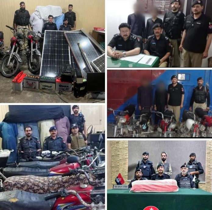3 عدد مسروقہ موٹرسائیکل، 6 عدد سولرسسٹم، چار عدد بیٹریاں، دو عدد پانی کی موٹر و سمرسیبل، ایک عدد ڈی وی آر، ایک عدد ٹیلی فون سمیت مختلف مسروقہ سامان بھی برآمد کرلیا.