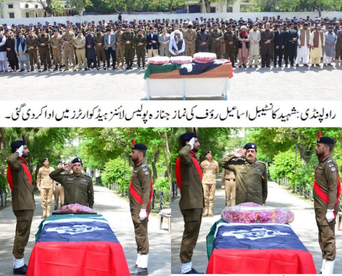 راولپنڈی( )شہید کانسٹیبل اسماعیل رؤف کی نمازجنازہ پولیس لائنز ہیڈکوارٹرز میں ادا کر دی گئی، پولیس کے چاق وچوبند دستوں نے شہید کانسٹیبل کے جسد خاکی کو سلامی پیش کی، نماز جنازہ میں ایس ایس پی آر آئی بی عارف شہباز خان، ایس ایس پی آپریشنز فلائٹ لیفٹیننٹ(ر) حافظ کامران اصغر، پاک آرمی، سول انتظامیہ اور لواحقین کے ساتھ پولیس افسران و جوانواں اور شہریوں کی کثیر تعداد میں شرکت،نماز جنازہ کی ادائیگی کے بعد شہید کانسٹیبل کا جسد خاکی سرکاری اعزاز کے ساتھ ان کے آبائی علاقہ تھانہ چونترہ (ڈھولیال) روانہ کر دیا گیا، شہید کی لازوال قربانیاں محکمہ کے لیے عزت و تکریم کا باعث ہیں،راولپنڈی پولیس جرائم کی روک تھام اور شہریوں کی حفاظت کے دوران کسی قربانی سے دریغ نہیں کرے گی، ایس ایس پی آپریشنز۔تفصیلات کے مطابق شہید کانسٹیبل اسماعیل رؤف کی نمازجنازہ پولیس لائنز ہیڈکوارٹرز میں ادا کر دی گئی، پولیس کے چاق وچوبند دستوں نے شہید کانسٹیبل کے جسد خاکی کو سلامی پیش کی، نماز جنازہ میں ایس ایس پی آر آئی بی عارف شہباز خان، ایس ایس پی آپریشنز فلائٹ لیفٹیننٹ(ر) حافظ کامران اصغر، پاک آرمی، سول انتظامیہ اور لواحقین کے ساتھ پولیس افسران و جوانواں اور شہریوں کی کثیر تعداد میں شرکت کی،نماز جنازہ کی ادائیگی کے بعد شہید کانسٹیبل کا جسد خاکی سرکاری اعزاز کے ساتھ ان کے آبائی علاقہ تھانہ چونترہ (ڈھولیال)روانہ کر دیا گیا، شہیدکانسٹیبل اسماعیل رؤف گزشتہ روز مری روڈ پر نامعلوم کار سوار ملزمان کی فائرنگ سے شہید ہوئے تھے، جبکہ کانسٹیبل عاصم فائرنگ سے زخمی ہوئے تھے، شہید کانسٹیبل اسماعیل رؤف نے سوگواران میں والدہ، بیوہ اور دو بیٹوں کو چھوڑا ہے، ایس ایس پی آپریشنزفلائٹ لیفٹیننٹ(ر) حافظ کامران اصغر کا کہناتھاکہ شہید کی لازوال قربانیاں محکمہ کے لیے عزت و تکریم کا باعث ہیں، شہداء پولیس ہمارے محسن ہیں جن کی قربانیوں کو کبھی فراموش نہیں کیا جا سکتا،شہید کے اہل خانہ ہماری فیملی کی طرح ہیں، ہم ہر موقعہ، ہر گھڑی شہداء کی فیملیز کے ساتھ کھڑے ہیں، شہید کانسٹیبل اسماعیل رؤف نے جرائم پیشہ عناصر سے مقابلہ کرتے ہوئے اپنی جان قربان کی، شہید کی قربانی کو ہمیشہ یاد رکھا جائے گا،راولپنڈی پولیس کے 117 افسران فرض کی راہ میں اپنی جانوں کا عظیم نذرانہ پیش کر چکے ہیں، راولپنڈی پولیس جرائم کی روک تھام اور شہریوں کی حفاظت کے دوران کسی قربانی سے دریغ نہیں کرے گی۔