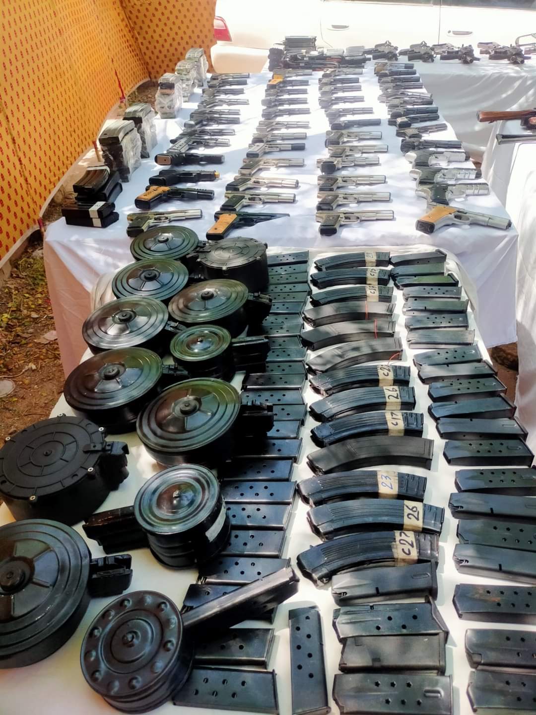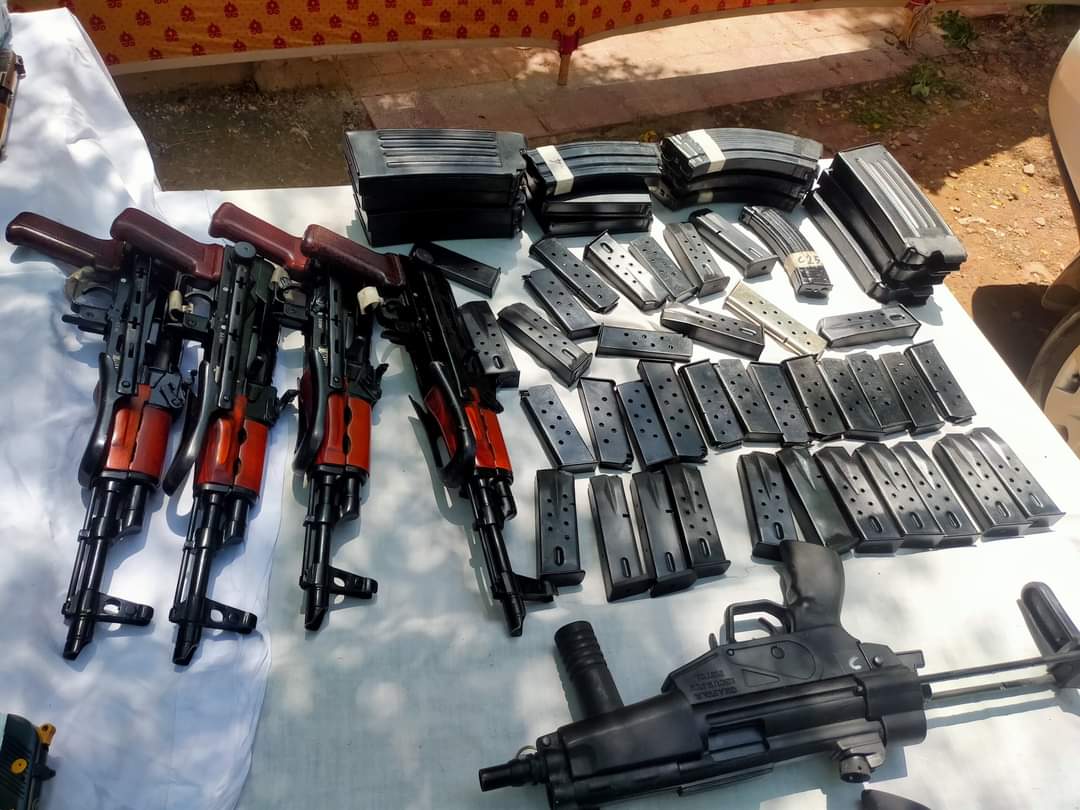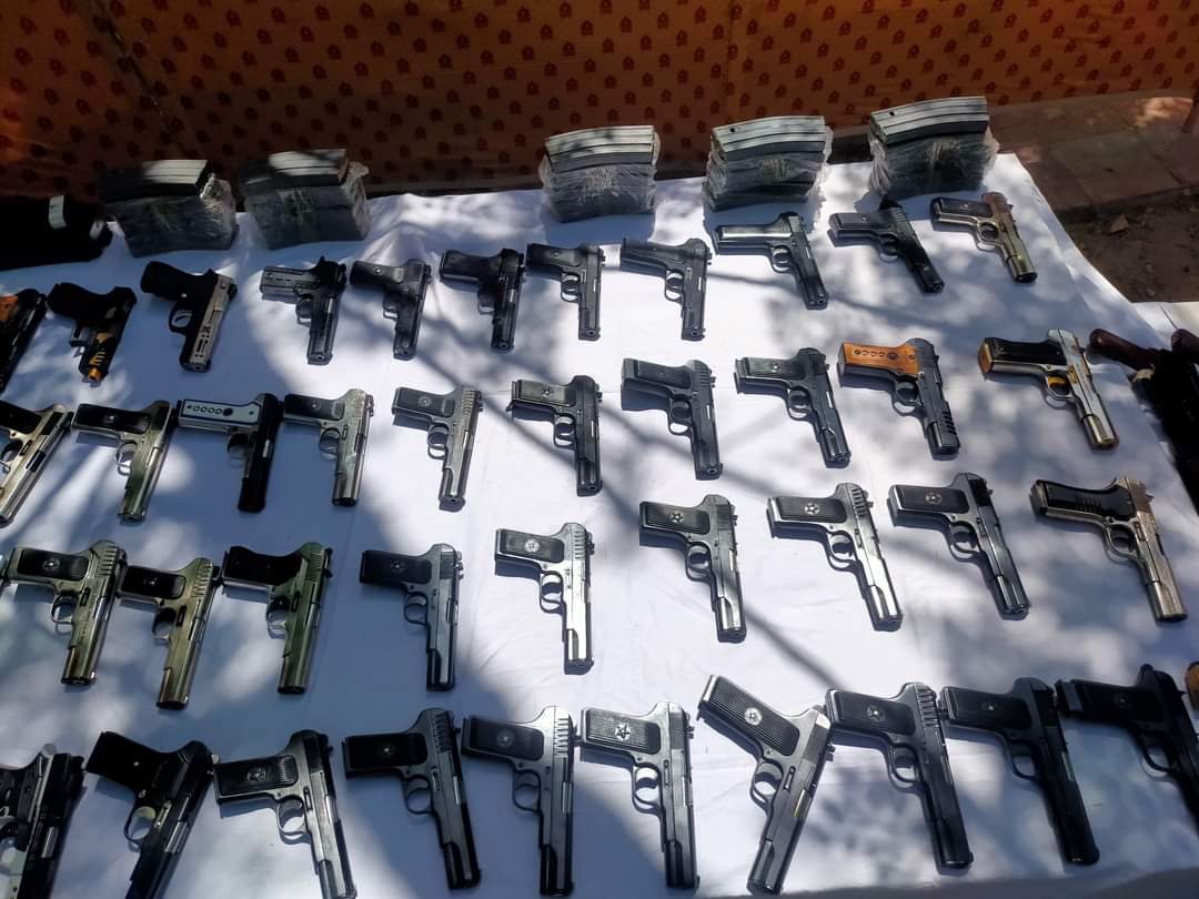 ملزمان کی گاڑی سے 50پسٹل30بور، 04کلاشنکوف، 04رائفل30بور، 02 رائفل ایم پی فائیو، 02رائفل30بور بشکل ایم فور، 01رائفل222بور، 01 رائفل 30بور کلاشنکوف نما، 02رائفل 12بور کلاشنکوف نما برآمد ہوئیں،