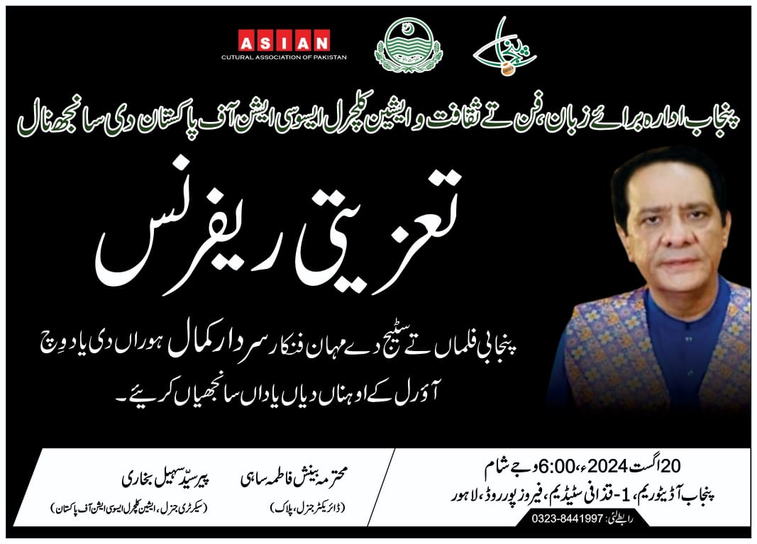 ایشین کلچرل ایسوسی ایشن آف پاکستان نے اپنی روایات کو برقرار رکھتے ہوئے پنجاب ادارہ برائے زبان فن و ثقافت کے اشتراک سے پنجابی فلم ، ڈرامہ کے لیجنڈ اداکار سردار کمال کی فنی خدمات کوخراج عقیدت پیش کرنے کیلئے ایک تعزیتی ریفرنس 20 ، اگست کو منعقد کیا جائے گا – اس بات کا اعلان ایشین کلچرل ایسوسی ایشن آف پاکستان کے سیکرٹری جنرل و چیئرمین ایوارڈز کمیٹی پیر سید سہیل بخاری نے کیا ہے – انہوں نے بتایا کہ تقریب میں اداکار ، تخلیق کار اور زندگی کے ہر شعبہ سے نمایاں افراد و شخصیات شریک ہو کر لیجنڈ اداکار سردار کمال کے فن اور شخصیت پر روشنی ڈالیں گے –