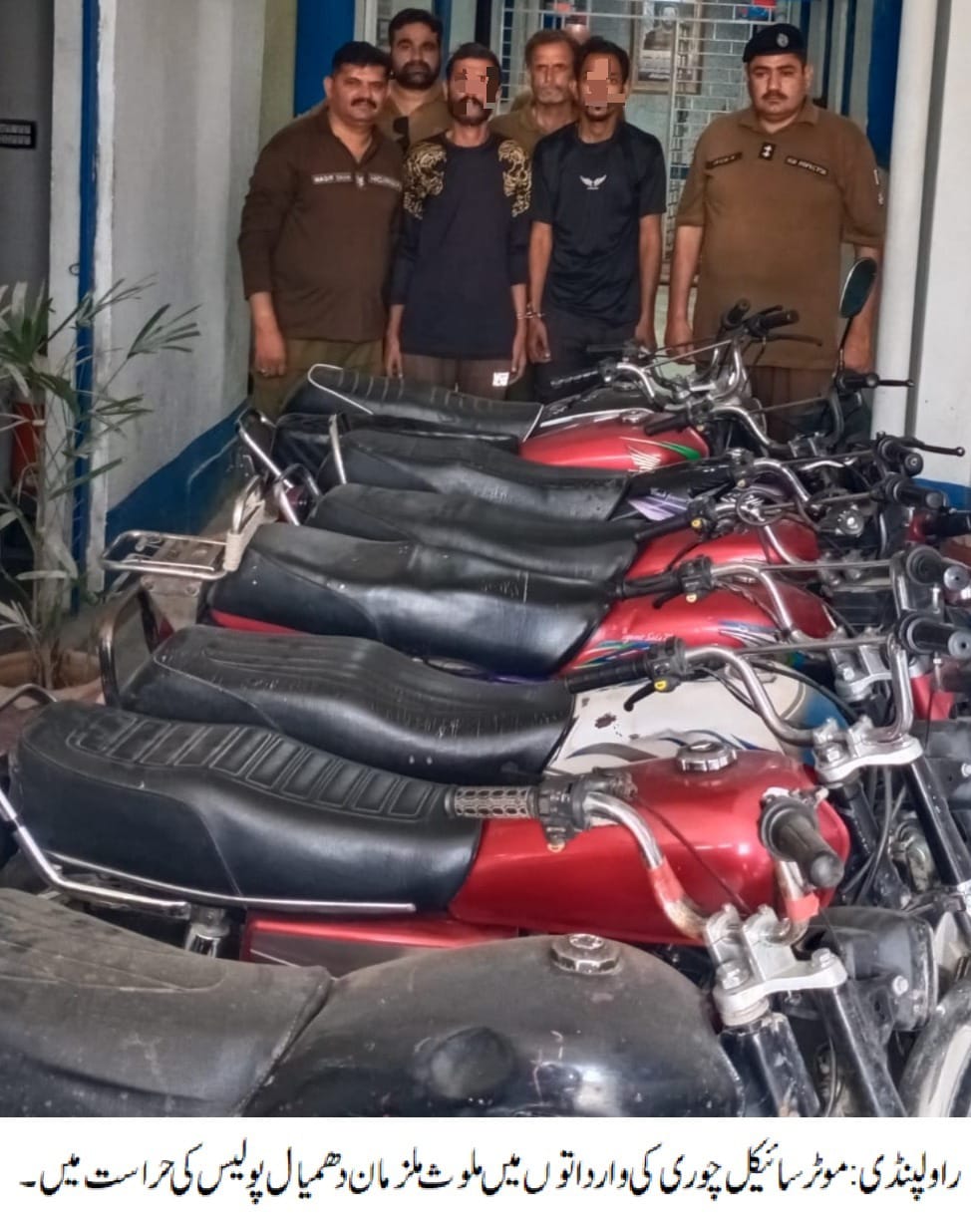 راولپنڈی( )دھمیال پولیس کی کاروائی،موٹرسائیکل چوری کی وارداتوں میں ملوث 02 ملزمان گرفتار،چوری شدہ 08 موٹرسائیکل برآمد۔تفصیلات کے مطابق دھمیال پولیس نے کاروائی کرتے ہوئے موٹرسائیکل چوری کی وارداتوں میں ملوث 02 ملزمان کو گرفتار کرلیا،گرفتار ملزمان کی شناخت محمد حسین اور یونس کے نام سے ہوئی،ملزمان سے چوری شدہ 08 موٹرسائیکل برآمدہوئے، ملزمان موٹرسائیکل چوری کے مقدمات میں ریکارڈ یافتہ ہیں،ایس پی صدر محمد نبیل کھوکھر نے دھمیال پولیس کو شاباش دیتے ہوئے کہا کہ شہریوں کو انکے قیمتی اثاثے سے محروم کرنے والے ملزمان کے خلاف بھرپور کاروائیاں جاری ہیں۔