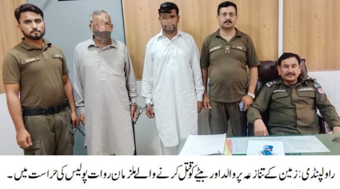 راولپنڈی( )تھانہ روات سب انسپکٹر منصور ستی کی ہمراہ پولیس ٹیم کاروائی، زمین کے تنازعہ پر والد اور بیٹے کو قتل کرنے والے 02 نامزد ملزمان گرفتار، ملزمان نے زمین کے تنازعہ پر فائرنگ کر کے احسن منیر اور اسکے والد محمد منیر کو قتل کر دیا تھا۔ تفصیلات کے مطابق روات پولیس نے کاروائی کرتے ہوئے زمین کے تنازعہ پر والد اور بیٹے کو قتل کرنے والے 02 نامزد ملزمان کو گرفتار کر لیا، گرفتار ملزمان میں کامران اور صغیر شامل ہیں،ملزمان نے زمین کے تنازعہ پر فائرنگ کر کے احسن منیر اور اسکے والد محمد منیر کو قتل کر دیا تھا، ملزمان کے 02 ساتھی عبداللہ اور شبیر قبل ازیں گرفتار ہو چکے ہیں،واقعہ کا مقدمہ رواں سال جولائی میں درج کیا گیا تھا، ایس پی صدر محمد نبیل کھوکھرکا کہنا تھا کہ شہریوں کی جان ومال کی حفاظت اور سہولیات کی فراہمی کو یقینی بنایا جا رہا ہے۔