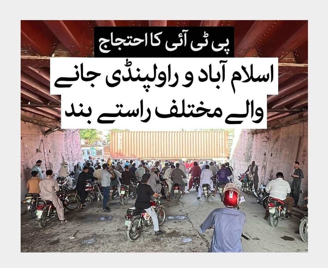 پاکستان تحریک انصاف کی طرف سے راولپنڈی میں جلسے کے بجائے احتجاج کی کال کے بعد جڑواں شہروں کے راستوں کو بند کر دیا گیا ہے۔ راولپنڈی کی مرکزی شاہراہ مری روڈ پر جگہ جگہ کنٹینرز لگا کر سڑک بند کی گئی ہے۔ اس کے علاوہ اسلام آباد کی طرف جانے والی ایکسپریس وے پر بھی مختلف مقامات پر کنٹینرز رکھ دیے گئے ہیں۔ روات ٹی چوک، کھنہ پل، فیض آباد اور راولپنڈی میں لیاقت باغ کے اطراف کے علاقے گزشتہ رات سے بند ہیں۔ انتظامیہ نے دفعہ 144 کے نفاذ کا اعلان کیا ہے اور کسی بھی قسم کے احتجاج کی اجازت دینے سے انکار کیا ہے۔ اس صورتِ حال کے باعث شہریوں کو شدید مشکلات کا سامنا ہے۔ میٹرو بس سروس بھی جزوی طور پر معطل ہے۔ کسی بھی صورتِ حال سے نمٹنے کے لیے آنسو گیس کے شیلز سے لیس پولیس اہلکار بھی تعینات ہیں