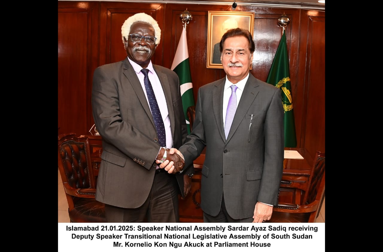 اسلام آباد (ٹی این ایس): سپیکر قومی اسمبلی سردار ایاز صادق نے کہا ہے کہ جنوبی سوڈان افریقہ میں ایک اہم مقام رکھتا ہے اور پارلیمانی سفارت کاری دونوں ممالک کے عوام کو قریب لانے میں کلیدی کردار ادا کر سکتی ہے۔ انہوں نے کہا کہ پاکستان 2011 میں جنوبی سوڈان کی آزادی کو تسلیم کرنے والے پہلے ممالک میں شامل تھا۔ جذبہ خیر سگالی کے طور پر سپیکر صادق نے پاکستان انسٹی ٹیوٹ فار پارلیمانی سروسز میں جنوبی سوڈانی قانون سازوں کے لیے مفت تربیت کے مواقع کی پیشکش کی۔ اس اقدام کا مقصد جنوبی سوڈان کے قانون سازوں کی صلاحیت کو بڑھانا اور دونوں پارلیمانوں کے درمیان علم کے تبادلے کو آسان بنانا ہے۔