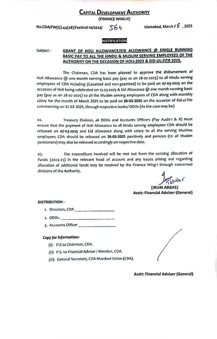 اسلام آباد (ٹی این ایس) سی ڈی اے مزدور یونین (سی بی اے) کے ساتھ طے شدہ معاہدے کے تحت سی ڈی اے انتظامیہ نے ادارے میں کام کرنے والے تمام مسلم ملازمین کے لیے عیدالاؤنس کی منظوری دے دی جسکا باقاعدہ نوٹیفیکیشن جاری کردیا گیا ہے۔نوٹیفیکیشن کے تحت مورخہ26مارچ بروزبدھ کو تمام ملازمین کے لیے ایک موجودہ بنیادی تنخواہ بطورعیدالاؤنس کی ادائیگی ماہانہ تنخواہ کے ساتھ کی جائے گی،اس موقع پر سی ڈی اے مزدور یونین کے جنرل سیکرٹری چوہدری محمد یٰسین نے چیئرمین سی ڈی اے چوہدری محمد علی رندھاوا،ممبر ایڈمنسٹریشن طلعت محمود،ممبرفنانس طاہرنعیم اختر اور سی ڈی اے انتظامیہ کا شکریہ ادا کرتے ہوئے کہا کہ ملک کے موجودہ مشکل معاشی حالات کے باوجود ایسے اقدامات سے یقینا سی ڈی اے کے غریب ملازمین کی خوشیوں میں اضافہ ہو گا اوروہ اس مہنگائی کے دور میں بہتر انداز میں اپنا مذہبی تہوار منا سکیں گے،انھوں نے کہا کہ اسلام آبادہائی کورٹ سے ملازمین کے پلاٹوں کا فیصلہ تحریری طورپر موصول ہو گیا ہے اور جس پر ہنگامی بنیادوں پر کام جاری ہے انشاء اللہ بہت جلد تمام ملازمین کو پلاٹوں کی قرعہ اندازی کروائی جائے گی، انھوں نے تمام ملازمین سے گزارش کی کہ وہ صبر و تحمل کا مظاہرہ کریں اورکسی بھی بے بنیاداورجھوٹی افواہوں پر یقین نہ کریں،اس موقع پر انھوں نے چیئرمین سی ڈی اے اور ممبرپلاننگ سے درخواست کی کہ وہ پلاٹوں کی الاٹمنٹ کے عمل کو تیزکریں تاکہ فی الفورقرعہ اندازی ہو سکے۔