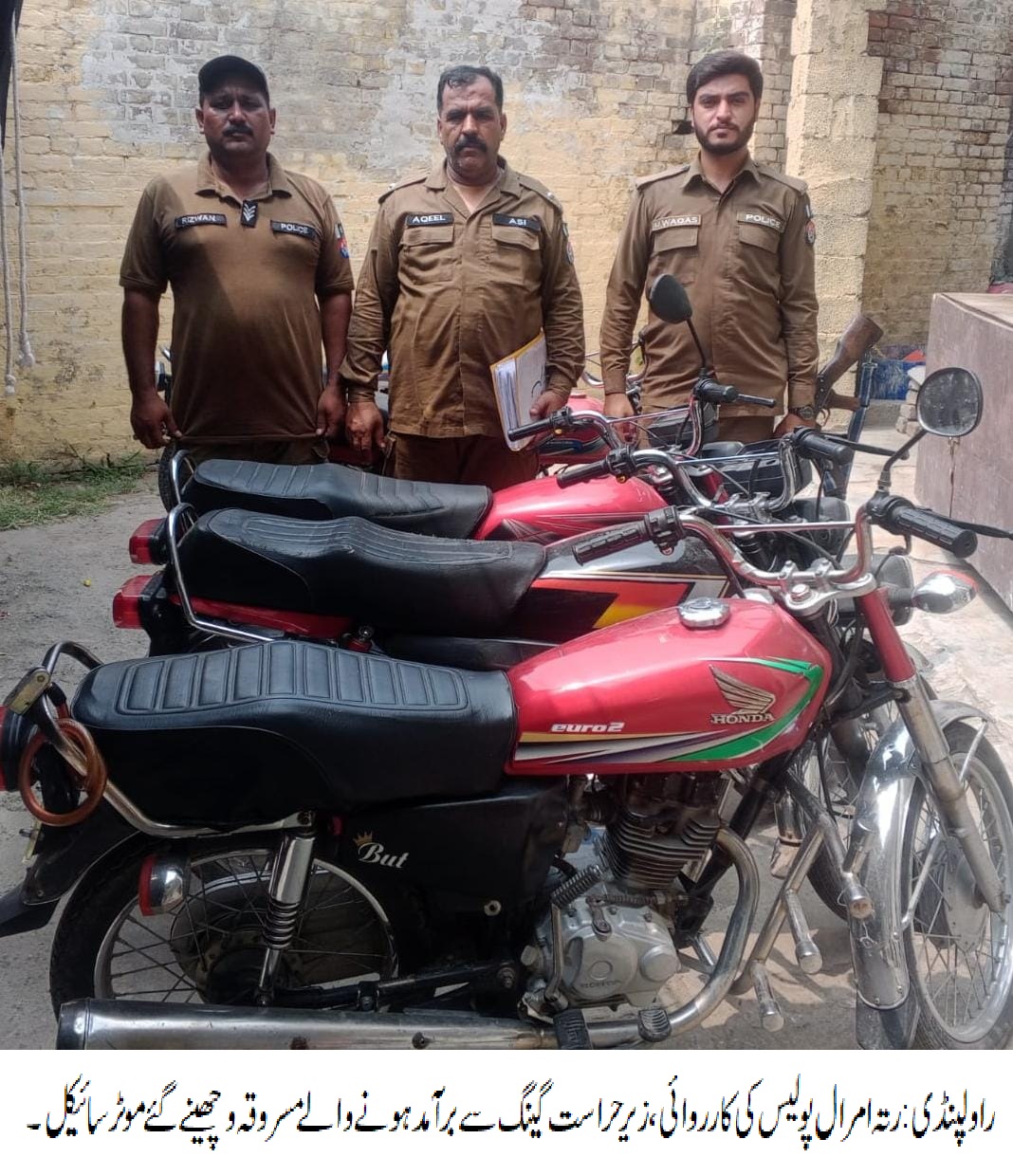 راولپنڈی (ٹی این ایس) رتہ امرال پولیس کی کاروائی، ڈکیتی،موٹر سائیکل چوری کے مقدمات میں ملوث 5 رکنی گینگ گرفتار، زیر حراست گینگ سے مسروقہ و چھینے گئے 3 موٹر سائیکل برآمد۔ تفصیلات کے مطابق رتہ امرال پولیس نے کاروائی کرتے ہوئے ڈکیتی،موٹر سائیکل چوری کے مقدمات میں ملوث 5 رکنی گینگ کو گرفتار کر لیا، زیر حراست گینگ سے مسروقہ و چھینے گئے 3 موٹر سائیکل برآمد ہوئے، ایس پی راول محمد حسیب راجہ کا کہنا تھا کہ زیرحراست افراد کو ٹھوس شواہد کے ساتھ چالان عدالت کیا جائے گا، شہریوں کو انکے قیمتی اثاثہ سے محروم کرنے والے افراد قانون کی گرفت سے نہیں بچ سکتے۔
