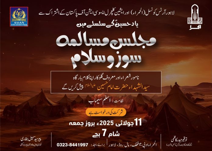 یاد حسین علیہ السلام کے سلسلے میں مجلس مسالمہ ، سوز و سلام کی محفل آج 11 ، جولائی 2025 ء بروز جمعہ الحمراء ادبی بیٹھک شاہراہ قائداعظم لاہور شام 7 ، بجے منعقد ہو رہی ہے –