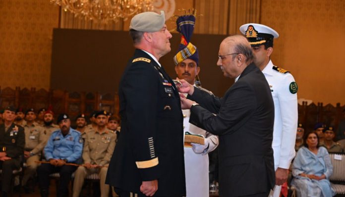 اسلام آباد (ٹی این ایس)(آئی پی ایس )یونائیٹڈ اسٹیٹس سینٹرل کمانڈ (سینٹ کام) کے کمانڈر جنرل مائیکل ایرک کوریلا کو نشانِ امتیاز ملٹری اعزاز سے نواز دیا گیا۔پاک فوج کے شعبہ تعلقات عامہ (آئی ایس پی آر) کے مطابق صدر آصف زرداری نے ایوانِ صدر میں باوقار تقریب میں جنرل کوریلا کو اعزاز عطا کیا۔آئی ایس پی آر نے بتایاکہ جنرل مائیکل کوریلا کو پاک امریکا عسکری تعاون کو فروغ دینیمیں مثالی خدمات پر اعزازسے نوازا گیا۔