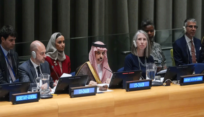 نیویارک (ٹی این ایس) اقوام متحدہ میں فلسطینی مسئلے کے پرامن حل اور دو ریاستی فارمولے پر عملدرآمد کے لیے ہونے والی اعلیٰ سطحی عالمی کانفرنس کا آغاز ہو گیا، جس میں سعودی عرب اور فرانس کی میزبانی میں متعدد عالمی رہنماؤں نے شرکت کی۔