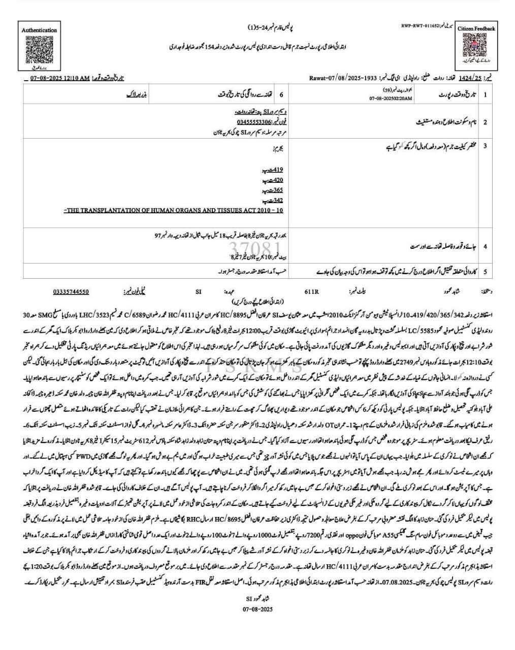 تھانہ روات پولیس نے بحریہ ٹاؤن فیز 8 کے ابوبکر بلاک میں بڑی کارروائی کرتے ہوئے گردوں کی غیر قانونی پیوندکاری میں ملوث گروہ کے خلاف کامیاب چھاپہ مارا، جس میں گروہ کا ایک کارندہ گرفتار کر لیا گیا، جبکہ گروہ کے چھ ارکان فرار ہو گئے۔