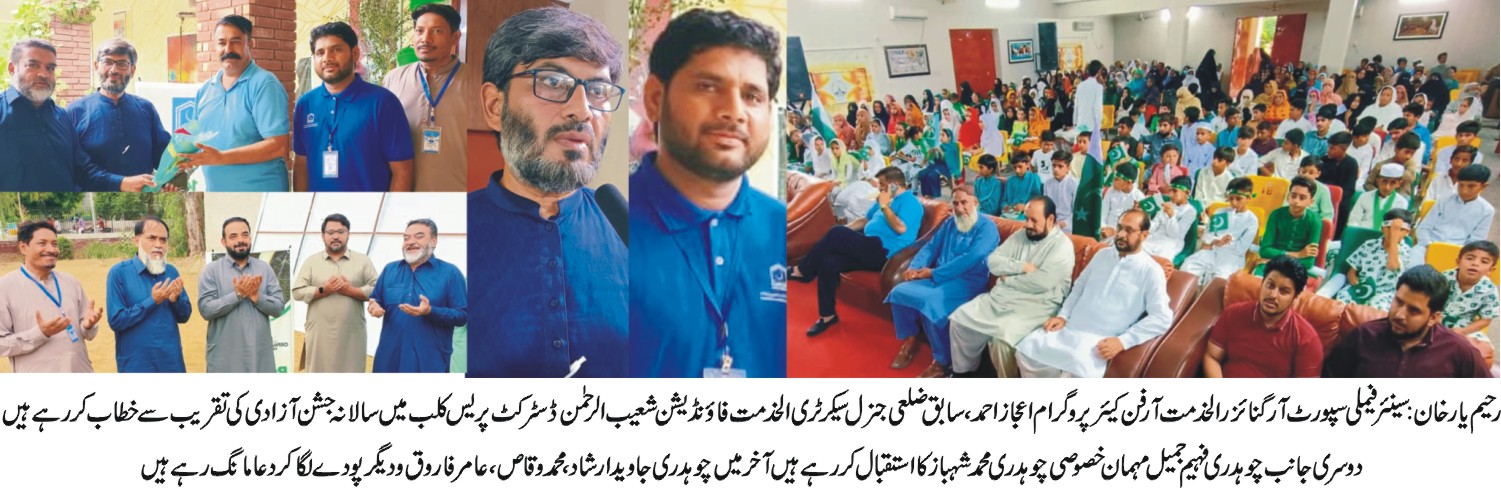 رحیم یارخان: سینئر فیملی سپورٹ آرگنائزر الخدمت آرفن کیئر پروگرام اعجازاحمد، سابق ضلعی جنرل سیکرٹری الخدمت فاؤنڈیشن شعیب الرحمٰن ڈسٹرکٹ پریس کلب میں سالانہ جشن آزادی کی تقریب سے خطاب کررہے ہیں دوسری جانب چوہدری فہیم جمیل مہمان خصوصی چوہدری محمدشہبازکااستقبال کررہے ہیں آخرمیں چوہدری جاویدارشاد، محمدوقاص، عامرفاروق ودیگرپودے لگاکردعامانگ رہے ہیں۔