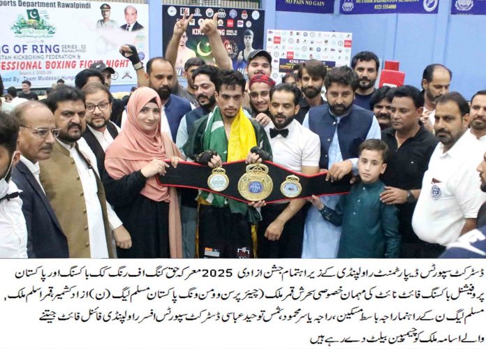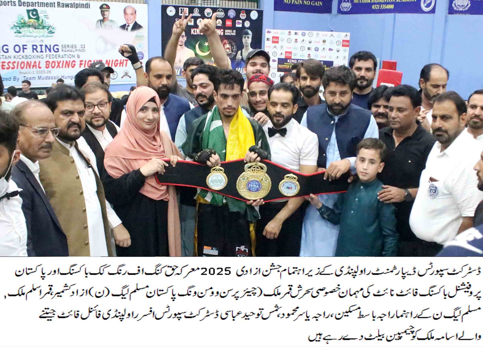 راولپنڈی (ٹی این ایس) کنگ آف رنگ پروفیشنل باکسنگ فائٹ کے ٹائٹل پاکستان کے اسامہ ساجد ملک اور بشری’ اختر کے نام، دونوں پاکستانی فائٹرز نے افغان حریفوں کو شکست دی۔کنگ آف رنگ کک باکسنگ فائٹ بشری اختر پاکستان اور منیرہ بختیاری افغانستان کے مابین ہوئی جس میں بشری اختر نے دوسرے ہی راؤنڈ میں افغانستان کی کھلاڑی کو ناک اؤٹ کر کے بیلٹ ٹائٹل پاکستان کے نام کیا۔جبکہ پروفیشنل باکسنگ فائٹ اسامہ ساجد ملک پاکستان بمقابلہ اسد ﷲ افغانستان کے مابین ہوئی جو کہ اسامہ ساجد ملک نے تیسرے ہی راؤنڈ میں اپنے حریف کو ناک آؤٹ کر کے بیلٹ ٹائٹل پاکستان کے نام کیا۔تفصیلات کے مطابق ڈسٹرکٹ سپورٹس ڈیپارٹمنٹ راولپنڈی کے زیر اہتمام جشن ازادی 2025 معرکہ حق کنگ اف رنگ کک باکسنگ اور پاکستان پروفیشنل باکسنگ فائٹ نائٹ ایونٹ شہباز شریف سپورٹس کمپلیکس میں منعقد ہوا،اختتامی تقریب کی مہمان خصوصی محترمہ سحرش قمر ملک چیئر پرسن ویمن ونگ پاکستان مسلم لیگ (ن) ازاد کشمیر تھی ان کے ہمراہ قمر اسلم ملک,مسلم لیگ ن کے راہنما راجہ باسط مسکین،راجہ یاسر محمود پی ایس ٹو،برسٹر دانیال چوہدری ایم این اے سردار طاہر،سردار نعیم،ملک رئیس اعوان،ملک نوید صادق،ملک عاصم بہاولپور ایکسپریس صدر صدام عباسی تھے۔مہمان خصوصی سحرش قمر ملک نے کھلاڑیوں میں میڈلز اور آفیشلز میں شیلڈز تقسیم کیں ڈسٹرکٹ سپورٹس ڈیپارٹمنٹ راولپنڈی کی شاندار ایونٹ کرانے پر مبارکباد دی، اس موقع پر چیئرمین آرگنائزنگ کمیٹی شمس توحید عباسی ڈسٹرکٹ سپورٹس افسر راولپنڈی ،آرگنائزنگ سیکرٹری مدثر بشیر ملک محمد ساجد اعوان کا بھی خوبصورت ایونٹ کرانے پر مبارکباد پیش کی