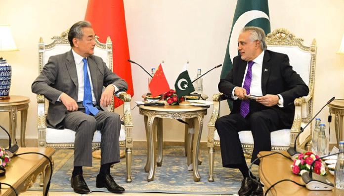 قبل ازیں چین کے وزیر خارجہ وانگ ای پاکستان کی وزارت خارجہ پہنچے جہاں نائب وزیراعظم و وزیر خارجہ اسحاق ڈار نے ان کا گرمجوشی سے استقبال کیا۔