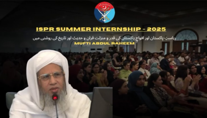 راولپنڈی (ٹی این ایس) آئی ایس پی آر سمر انٹرن شپ 2025 کے طلبہ نے چانسلر الغزالی یونیورسٹی مفتی عبد الرحیم کے ساتھ خصوصی نشست کی۔