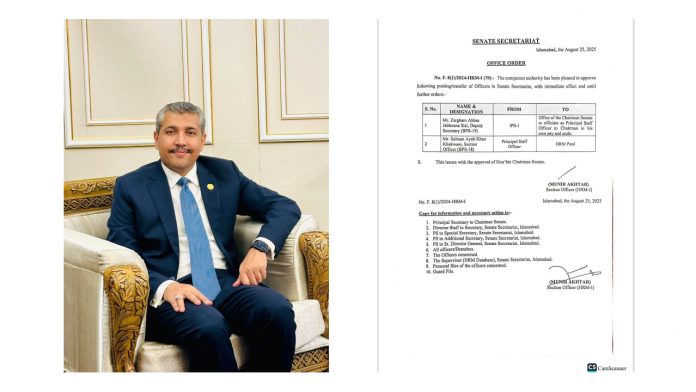 اسلام آباد (ٹی این ایس) سینٹ سیکرٹریٹ نے ضرغام عباس جبوآنہ سیال ڈپٹی سیکرٹری بی پی ایس19 کو چئیرمین سینٹ سید یوسف رضا گیلانی کا پرنسپل سٹاف آفیسر تعینات کرنے کا نوٹیفکیشن جاری کر دیا ہے۔ منگل کو جاری کئے گئے نوٹیفکیشن کے مطابق چئیرمین سینٹ کے پرنسپل سیکرٹری سلمان ایوب خان خاکوانی سیکشن بی پی ایس 18 کو ایچ آر ایم رپورٹ کرنے کی ہدایت کی گئی ہے۔nsr