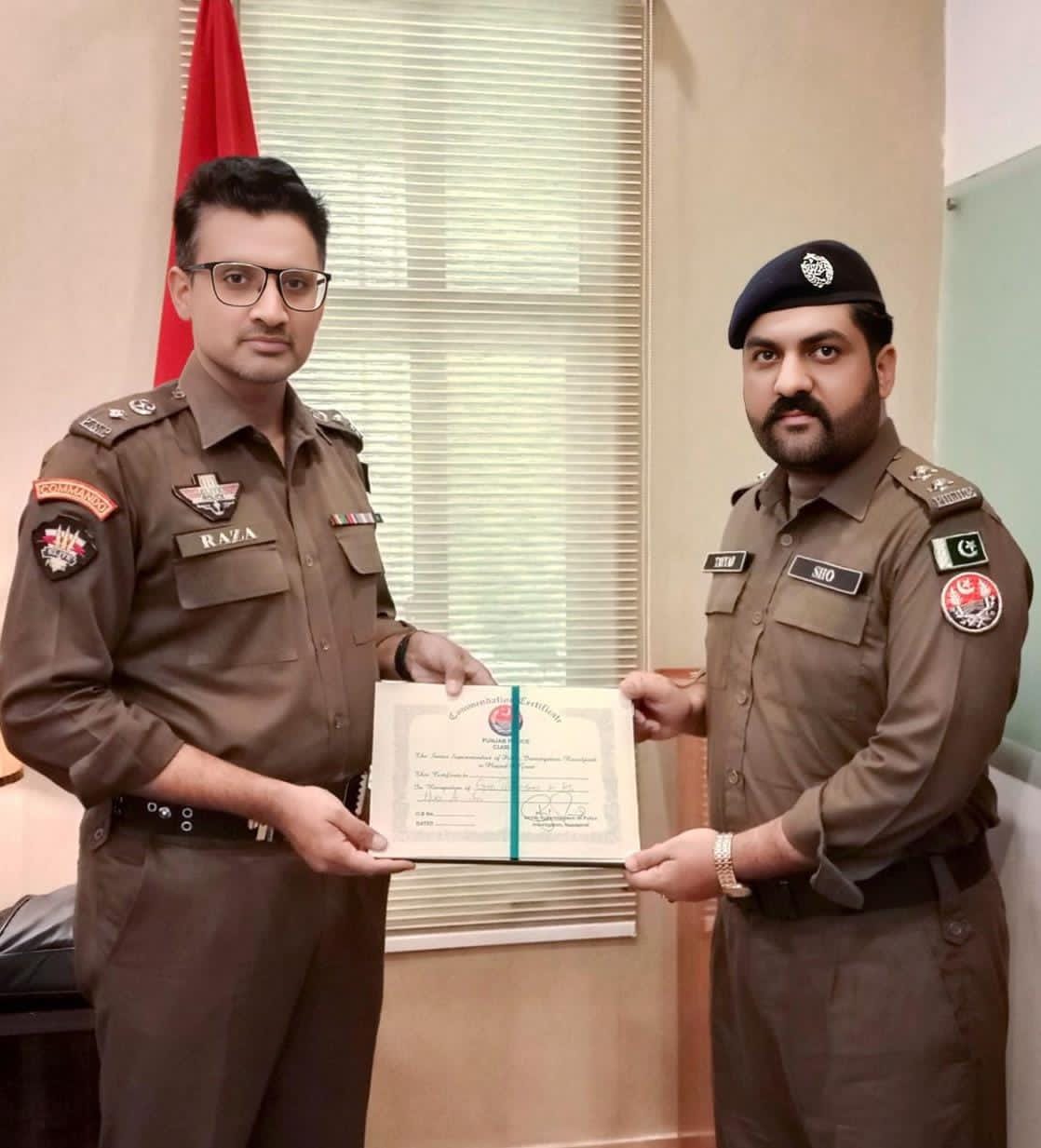 ایس ایس پی انویسٹیگیشن رضا تنویر سپرا نے ایس پی راول سعد ارشد، اے ایس پی صدر سرکل زینب ایوب اور ڈی ایس پی وارث خان سرکل رانا نعیم یسین کو تعریفی لیٹر دئیے،