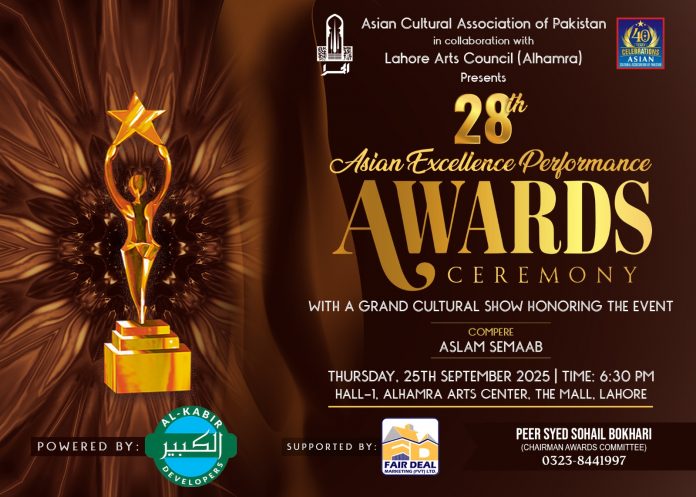 ایشین کلچرل ایسوسی ایشن آف پاکستان کے سیکرٹری جنرل و چیئرمین ایوارڈز کمیٹی پیر سید سہیل بخاری نے بتایا ہے کہ 28 – ویں ایشین ایکسی لینس پرفارمنس ایوارڈز کی تقریب 3 ، سال کے وقفہ کے بعد لاہور آرٹس کونسل الحمراء کے تعاون سے 25 ، ستمبر 2025ء شام 7 ، بجے منعقد ہو گی – جس میں زندگی کے ہر شعبہ کی شخصیات کو انکی اعلٰی کارکردگی پر ایوارڈز سے نوازا جائے گا – پیر سید سہیل بخاری نے مزید بتایا کہ سماجی و ثقافتی شخصیات اور زندگی کے ہر شعبہ سے نمایاں افراد و شخصیات شریک ہونگیں – ایک میگا ثقافتی پروگرام بھی تقریب کا حصہ ہوگا جس میں ملک کے نامور فنکار ، گلوکار اور گلوکارہ ،کامیڈین و قوال پرفارم کریں گے – علاوہ ازیں صوفی پرفارمنس ، علاقائی رقص ، دھمال ، ڈھول پرفارمنس بھی تقریب کا حصہ ھونگے – وفاقی و صوبائی وزراء ممبران قومی و صوبائی اسمبلی مہمانان خصوصی ھونگے – یاد رہے یہ تقریب 2 ، ستمبر کو منعقد ہونی تھی پنجاب میں سیلاب کی صورتحال کے پیش نظر تاریخ میں تبدیلی کی گئی ہے –