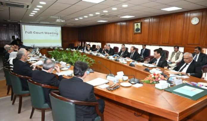اسلام آباد (ٹی این ایس) سپریم کورٹ کا انتظامی فل کورٹ اجلاس کا اعلامیہ جاری، اجلاس چیف جسٹس پاکستان یحییٰ آفریدی کی زیر صدارت ہوا، فل کورٹ اجلاس میں سپریم کورٹ کے ججز شریک ہوئے،اجلاس میں سپریم کورٹ رولز 2025 کا جائزہ لیا گیا