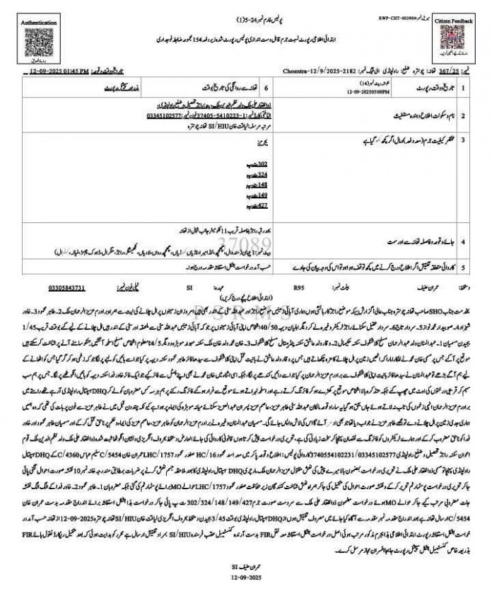 راولپنڈی (ٹی این ایس) تھانہ چونترہ عبداللہ سٹی واقعہ کی ایف آئی آر درج کرلی گئی ہے ۔