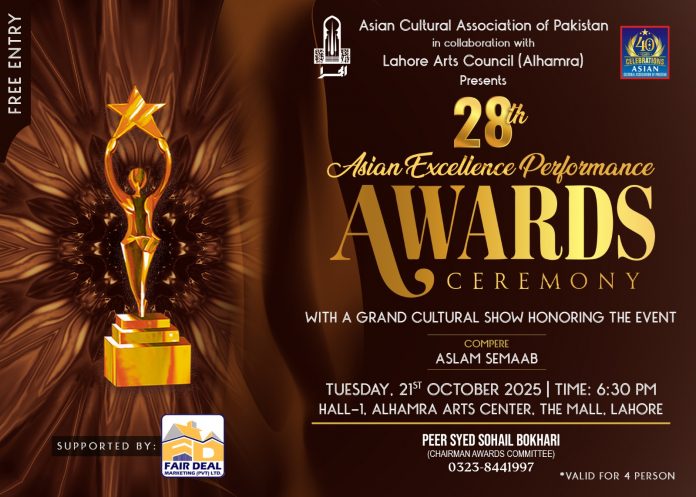 ایشین کلچرل ایسوسی ایشن آف پاکستان کے سیکرٹری جنرل و چیئرمین ایوارڈز کمیٹی پیر سید سہیل بخاری نے بتایا ہے کہ 28 – ویں ایشین ایکسی لینس پرفارمنس ایوارڈز کی تقریب لاہور آرٹس کونسل الحمراء کے تعاون سے 21 ، اکتوبر 2025ء شام 7 ، بجے منعقد ہو گی – جس میں زندگی کے ہر شعبہ کی شخصیات کو انکی اعلٰی کارکردگی پر ایوارڈز سے نوازا جائے گا – پیر سید سہیل بخاری نے مزید بتایا کہ سماجی و ثقافتی شخصیات اور زندگی کے ہر شعبہ سے نمایاں افراد و شخصیات شریک ہونگیں – ایک میگا ثقافتی پروگرام بھی تقریب کا حصہ ہوگا جس میں ملک کے نامور فنکار ، گلوکار اور گلوکارہ ،کامیڈین و قوال پرفارم کریں گے – علاوہ ازیں صوفی پرفارمنس ، علاقائی رقص ، دھمال ، ڈھول پرفارمنس بھی تقریب کا حصہ ھونگے – وفاقی و صوبائی وزراء ، سپیکر پنجاب اسمبلی ، ممبران قومی و صوبائی اسمبلی مہمانان خصوصی ھونگے –
