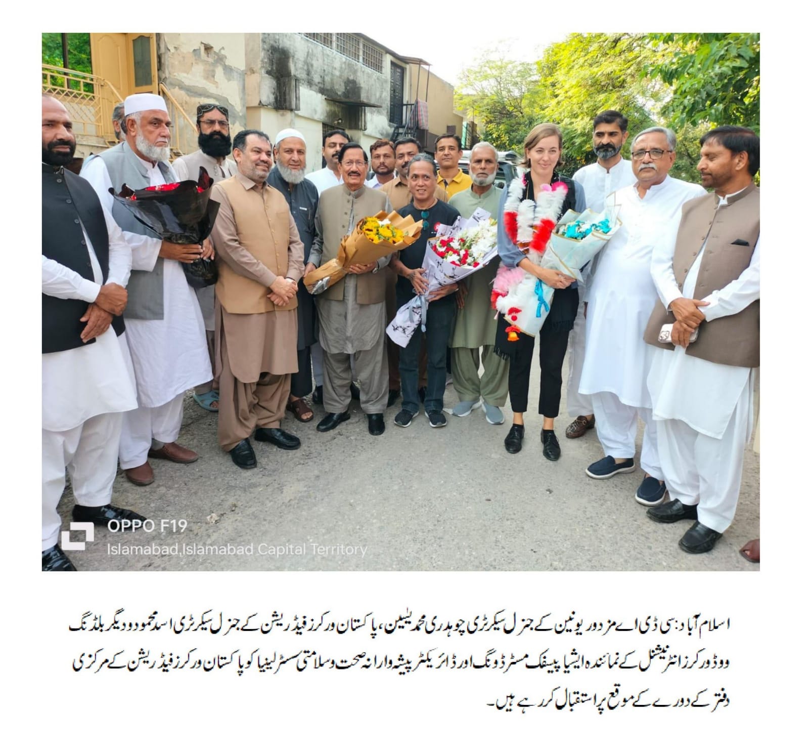 سی ڈی اے مزدور یونین کے جنرل سیکرٹری چوہدری محمد یٰسین نے وفد کو خوش آمدید کرتے ہوئے کہا کہ پاکستان ورکرز فیڈریشن اور بلڈنگ ووڈ ورکرز انٹرنیشنل کی عرصہ دراز سے پارٹنر شپ ہے اور ہم مل کر مزدوروں کی فلاح و بہبود کے لیے کام کر رہے ہیں،پاکستان میں مزدور خصوصی طور پر تعمیراتی مزدور بہت سے مسائل کا شکار ہے اور پیشہ وارانہ صحت و سلامتی کے قوانین عمل درآمد نہ ہونے کی وجہ سے آئے روز حادثات ہو رہے ہیں جس سے قیمتی جانوں کا نقصان ہو رہا ہے۔ پاکستان ورکرز فیڈریشن نے تعمیراتی مزدوروں کو منظم کرنے اور حقوق کے متعلق آگاہی کے لیے ماضی میں کام کیا ہے جس کے مثبت نتائج ملے ہیں۔ مستقبل میں بھی ہم بلڈنگ ووڈ ورکرز انٹرنیشنل کے ساتھ مل کر کام کرنے کے لیے تیار ہیں اور اس حوالے سے ہمیں حکومتی اداروں سمیت تمام سٹیک ہولڈرز کے ساتھ مشاورت کو یقینی بنایا جائے گا اس پر پاکستان ورکرز فیڈریشن مکمل تعاون کا یقین دلاتی ہے،بلڈنگ ووڈ ورکرز انٹرنیشنل کے وفد نے مزدور رہنماؤں کا پرتپاک استقبال کرنے پر شکریہ ادا کرتے ہوئے کہا کہ پاکستان ایک خوبصورت ملک ہے اور مزدور تحریک کے حوالے سے بڑی اہمیت کا حامل ہے۔ L