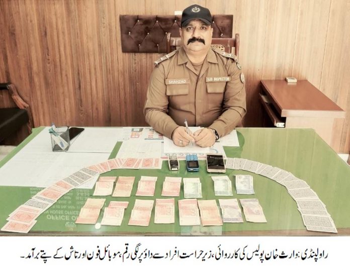راولپنڈی (ٹی این ایس) ایس ایچ او وارث خان کی زیرنگرانی شہزاد شاہ سب انسپکٹر کی ہمراہ پولیس ٹیم کارروائی، تاش کے پتوں پر جواء کھیلنے والے 8افراد گرفتار، داؤ پر لگی رقم 3 ہزار 100 روپے،3 موبائل فونز اور تاش کے پتے برآمد۔تفصیلات کے مطابق ایس ایچ او وارث خان خضر حیات کی زیرنگرانی پولیس ٹیم نے کارروائی کرتے ہوئے تاش کے پتوں پر جواء کھیلنے والے 8افراد کو گرفتار کرلیا،زیر حراست افراد سے داؤ پر لگی رقم 3 ہزار 100 روپے،3 موبائل فونز اور تاش کے پتے برآمدہوئے،ایس پی راول سعد ارشد کاکہنا تھا کہ زیر حراست افراد کو ٹھوس شواہد کے ساتھ چالان کیا جائے گا، قمار بازی دیگر معاشرتی برائیوں کی جڑ ہے۔