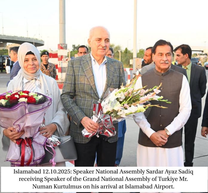 اسلام آباد (ٹی این ایس) تیسرے سہ فریقی اسپیکرز اجلاس میں شرکت کے لیے ترکیہ کی گرینڈ نیشنل اسمبلی کے اسپیکر نعمان کورتولموش پاکستان پہنچ گئے۔ اسپیکر قومی اسمبلی سردار ایاز صادق نے اسلام آباد ایئرپورٹ پر معزز مہمان کا پرتپاک استقبال کیا۔ اسپیکر قومی اسمبلی نے اسپیکر ترکیہ گرینڈ نیشنل اسمبلی کو خوش آمدید کہا اور معزز مہمان پھولوں کا گلدستہ بھی پیش کیا۔